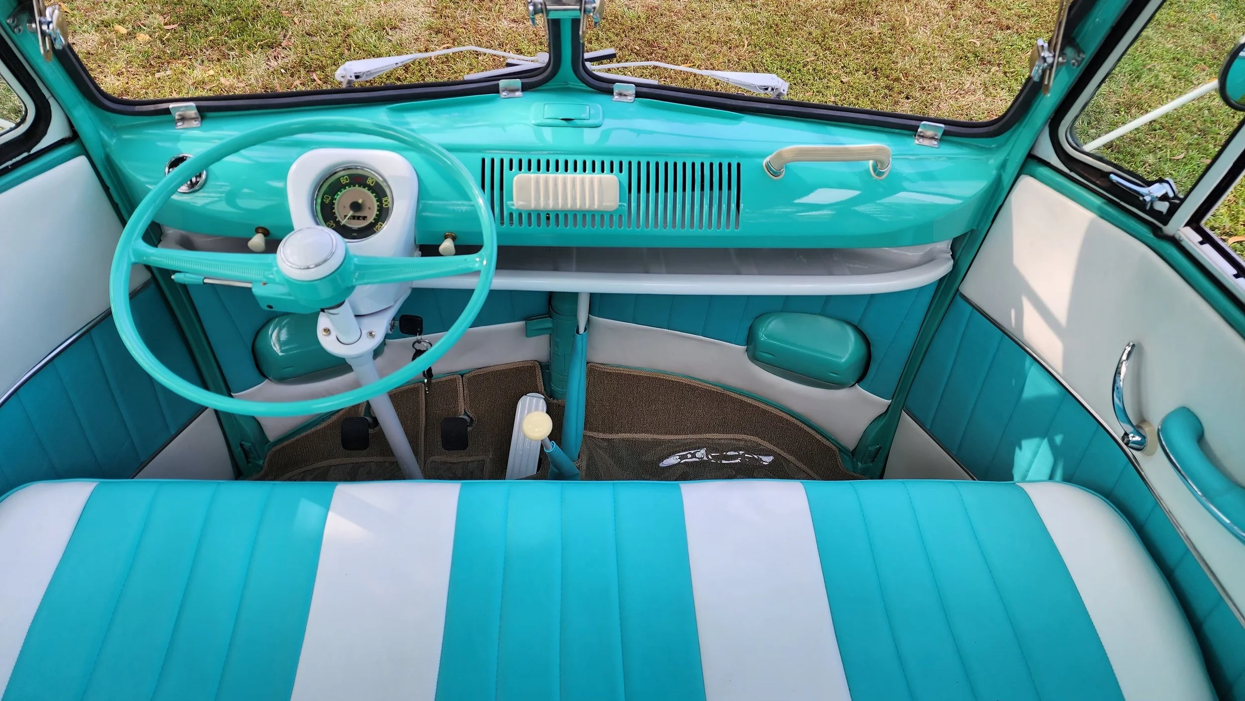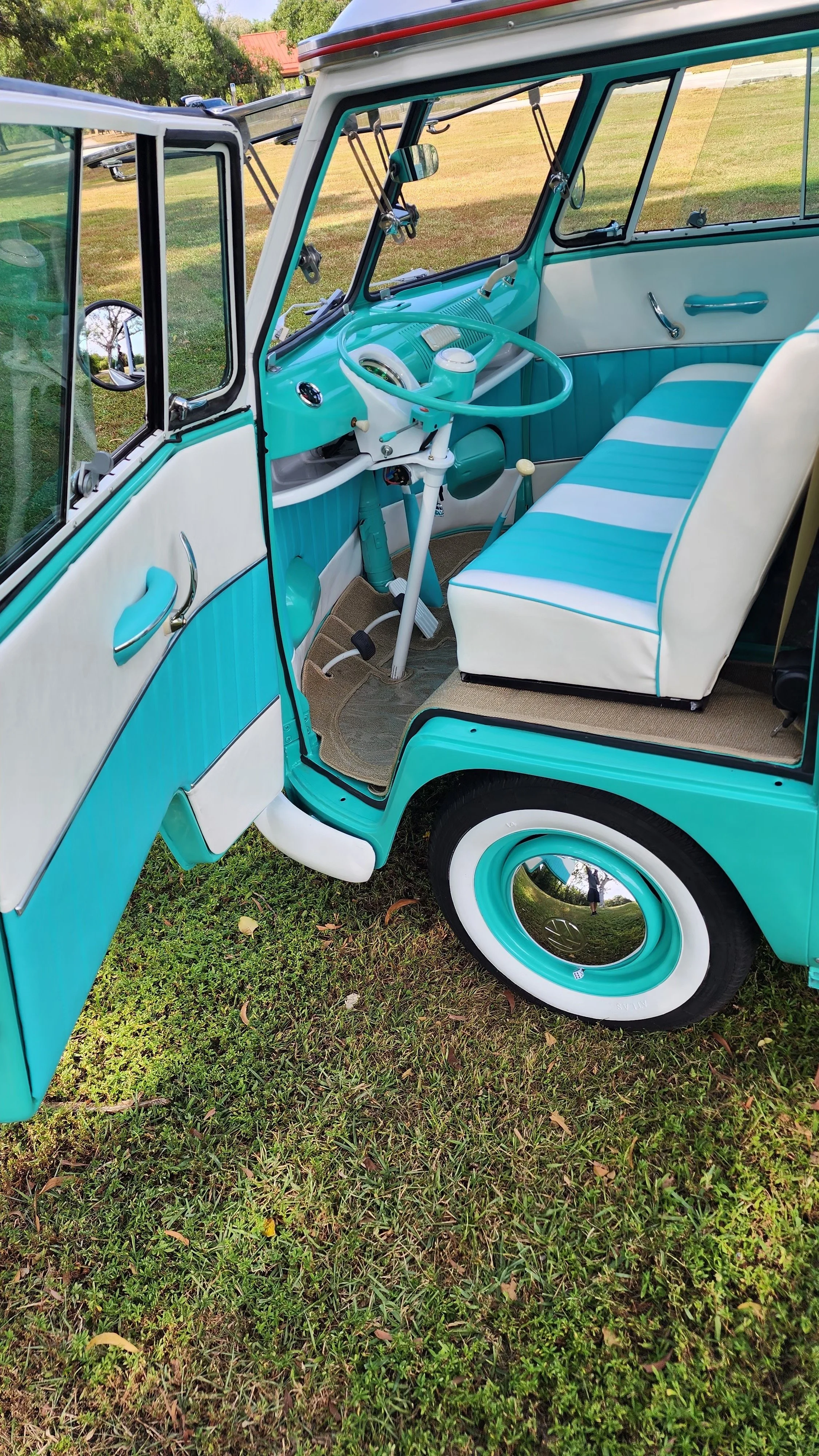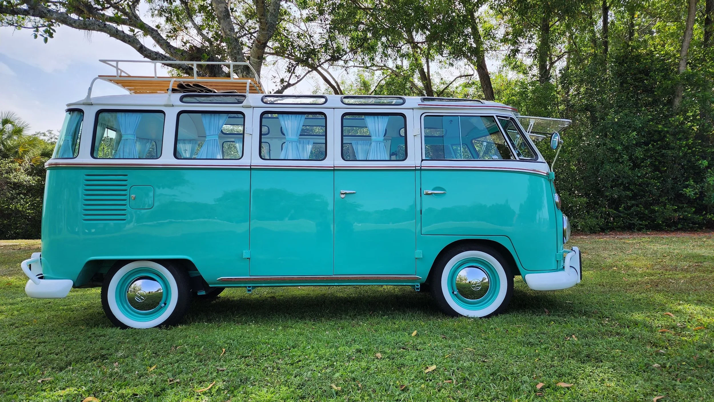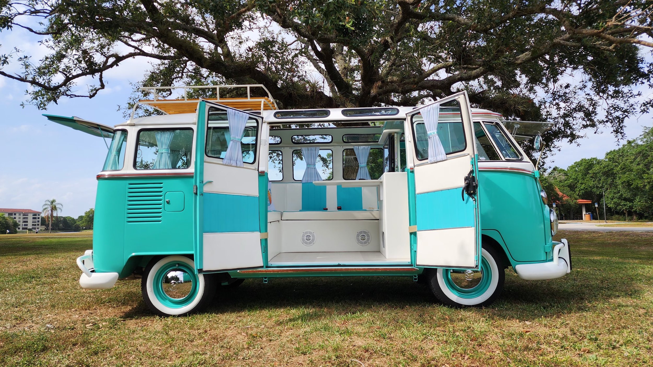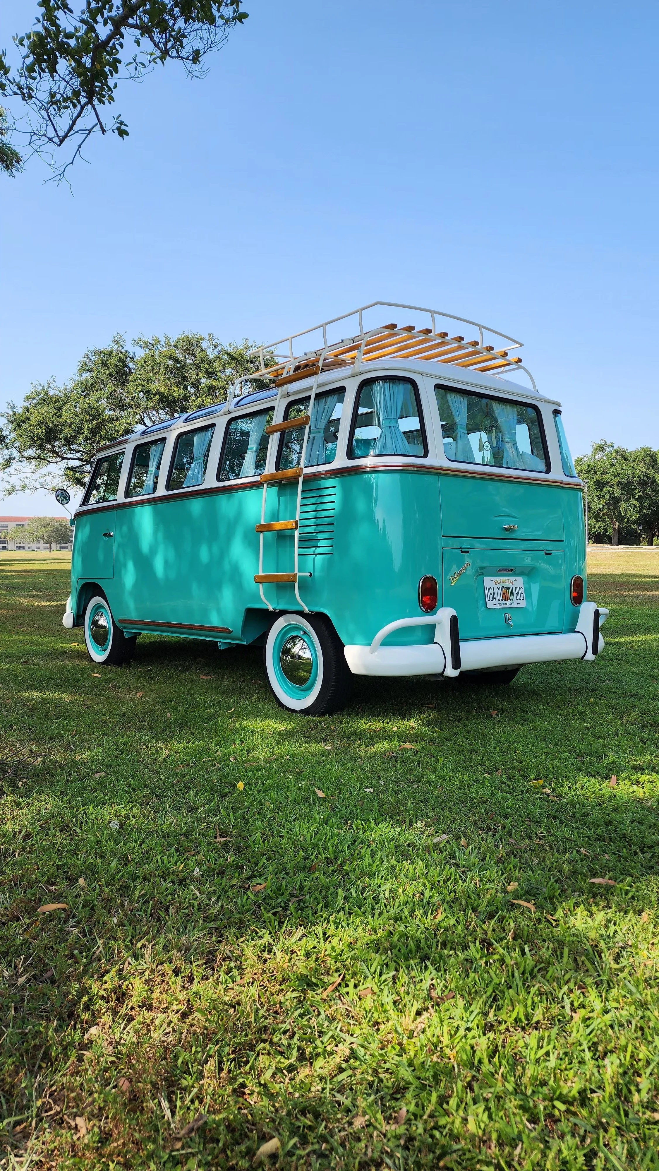 Manufactured in 1972 by Volkswagen in Brazil. This 23-w2indow VW bus was completely disassembled and painted in Tiffany Blue and Cream, completed with high-quality finishes and custom interior.